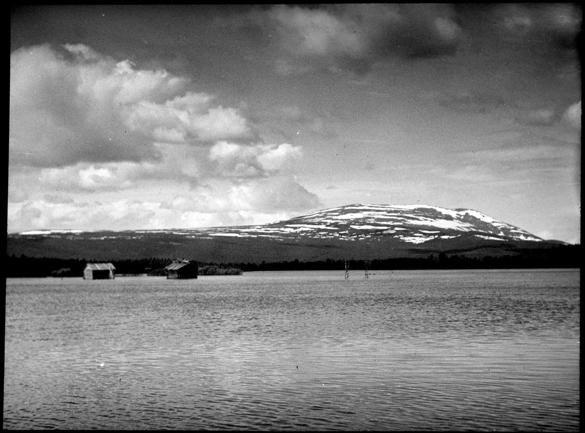 'Bildtext: ''Svaipa, sett från Storlaisan.'' Vy berget Svaipa sett från sjön i förgrunden. Fjället snöklätt. 2 små hus på avstånd. :: :: Ingår i serie med fotonr. 5155:1-10 numrerade med bildnr 101-109. Se även hela fotoserien med fotonr. 5155-5174.'