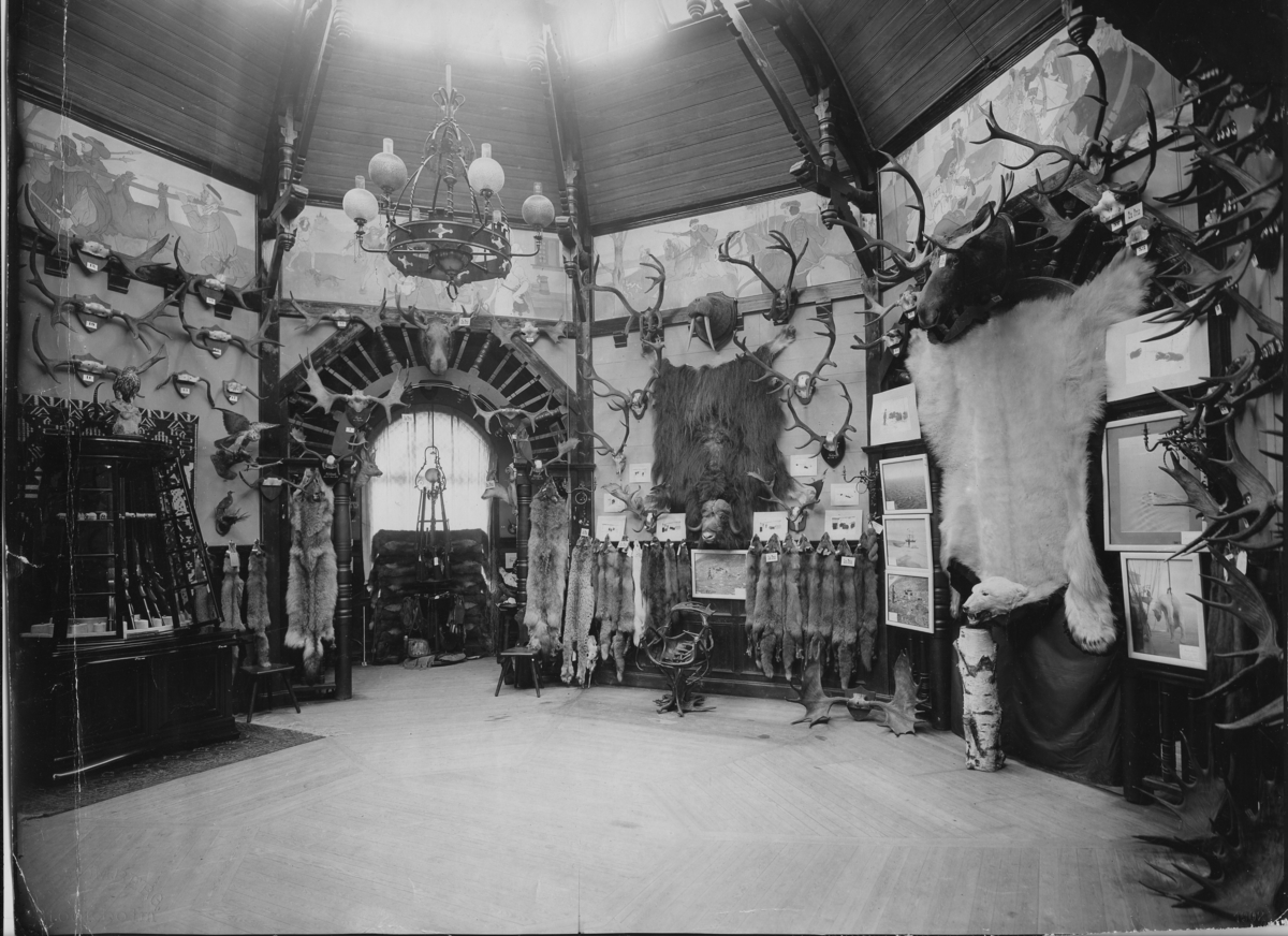 'Diverse foton på horn och gevär från jaktutställningar. :: :: Vy över oktagonalt rum med monterade djurhuvuden samt horn på väggarna samt hängande skinn och jaktutrustning. :: :: Ingår i serie med fotonr. 5599:1-17.'