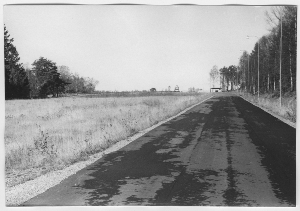 'Bildtext: ''Sedimentyta. Riktning 11.'' :: Vy med öppet fält, åkermark och asfalterad väg intill. :: :: Ingår i serie med fotonr. 6970:1-1125, dokumentation av Hisingens naturgeografi, visande landskapsformerna i stora drag och gjord inför exploateringen av området. Platserna för fotograferingen finns utsatta på karta i skala 1:4000 som finns på Göteborgs Naturhistoriska musem. Fotoriktningen mättes med kompass i gammalgrader.'