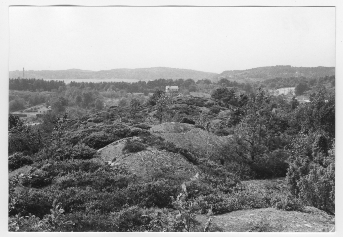 'Bildtext: ''Hällandskap. Riktning 230.'' :: Vy över berghäll bevuxen av enbuskar, ek och furuträd samt andra lövträd. På avstånd syns stuga, småhus. :: :: Ingår i serie med fotonr. 6970:1-1125, dokumentation av Hisingens naturgeografi, visande landskapsformerna i stora drag och gjord inför exploateringen av området. Platserna för fotograferingen finns utsatta på karta i skala 1:4000 som finns på Göteborgs Naturhistoriska musem. Fotoriktningen mättes med kompass i gammalgrader.'