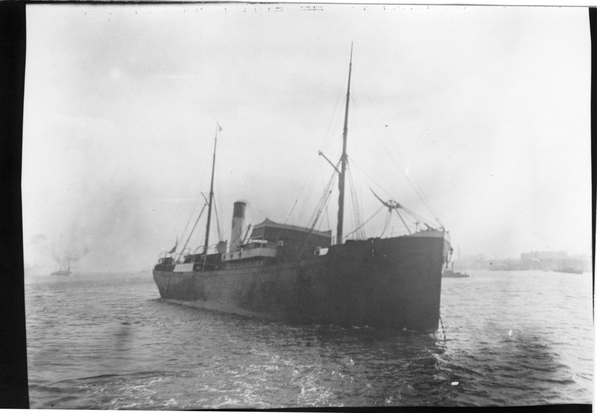 'Diverse fotografier från bl.a. dåvarande Nordrhodesia, nu Zambia, tagna av Konsul Magnus Leijer. :: :: Vy över en större båt utanför en hamn som är vagt synlig i bakgrunden. Även ytterligare en båt är synlig vid horisonten.'