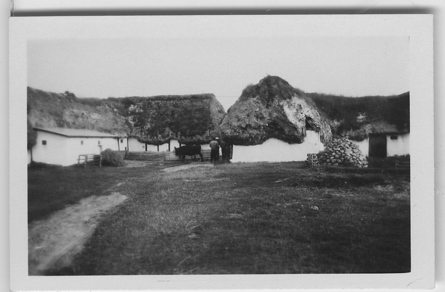 'Akkaexpedition, Bilder från Läsö och från båten (Skandia, FC 51). :: :: 2 gårdsbyggnader med halmtak, mellan dem är ett flertal människor synliga, samt en ko. Hög med stenblock liggande invid bygganden. :: :: Se fotonr. 5089:63, samma motiv. Ingår i serie 5089:1-63. Se även fotonr 2401-2453.'