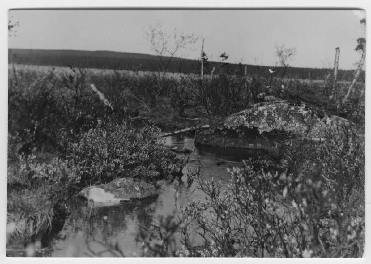 'Häckningsterräng för sävsparv, vy med ris/buskvegetation, stenblock och vattendrag med uppstickande avbrutna lövträdsstammar. :: :: Ingår i serie med fotonr. 3550-3567.'