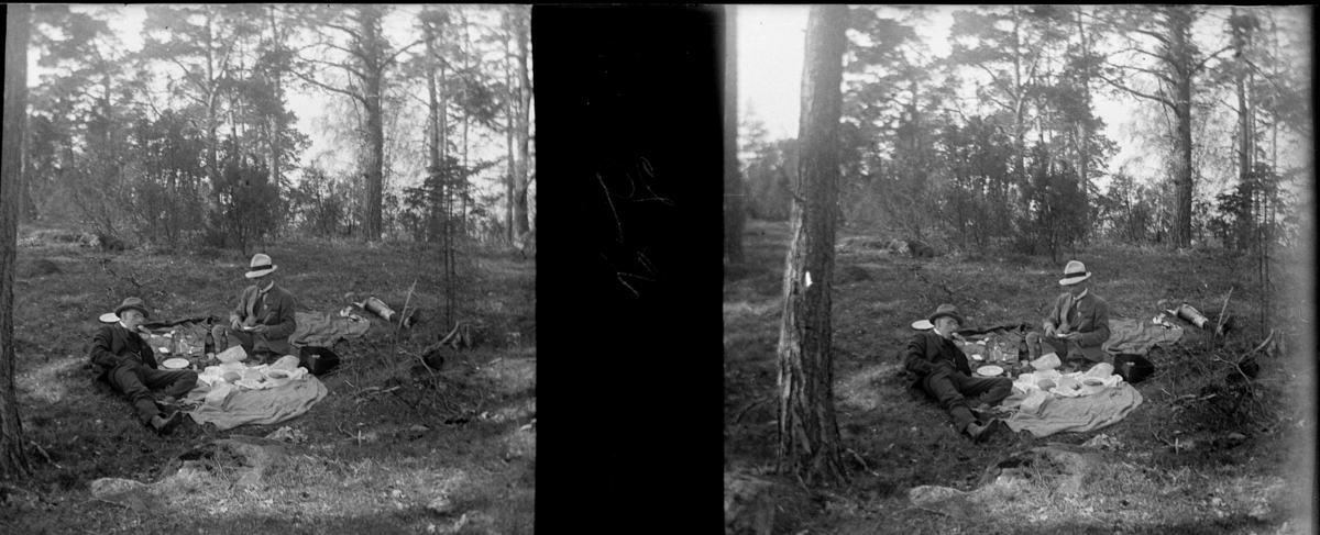'Bildtext: ''Pingstutfärd med Charleston och Romney.'' :: Vy med 2 män sittande på marken med uppdukad picknick på en filt. :: :: Ingår i serie med fotonr. 5261:1-14. Se även hela serien med fotonr. 5237-5267.'