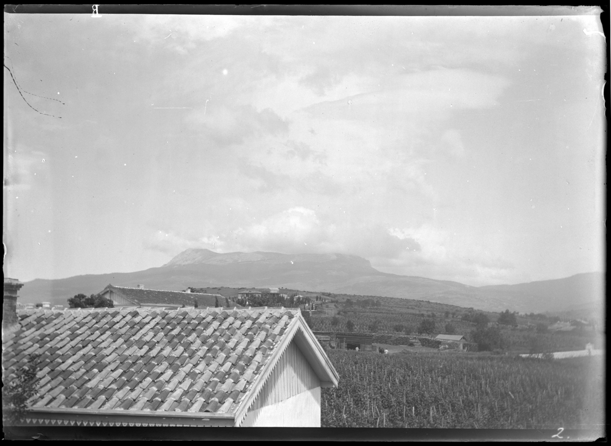 'I förgrunden hus och vy med ev. vinodling. På avstånd högar med timmer. I fonden berg. :: :: Ingår i serie med fotonr. 5287:1-22. Se även fotonr. 5269-5292 med bilder från Stuxbergs resa till Kaukasien.'