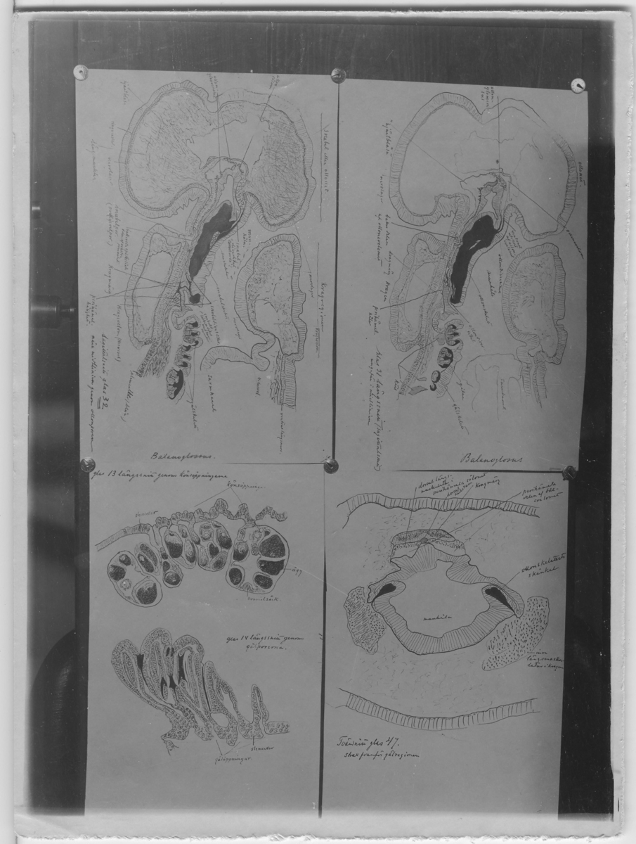 'Teckningar av preparat på glas. Illustration av ''längssnitt genom könsöppningen'' och ''tvärsnitt strax framför gälöppningen'' hos Balanoglossus :: Motivet består av fyra olika sidor. Namn på delar utsatta. :: :: ''Fotografier använda vid dissektionskursen våren 1928'' . :: Avfotograferade teckningar på skelett och organ. :: På baksidan av vissa står det Kerstin Nyblén :: V.T.-18 :: , Preparat, ur bok'