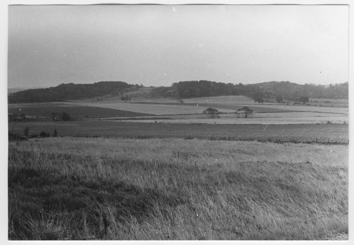 'Bildtext: ''Sedimentdalgång. Riktning 60.'' Vy över öppna gräsfält, öppna fält, åkrar med enstaka träd och buskar. På avstånd berghällar, delvis trädbevuxna. :: :: Ingår i serie med fotonr. 6970:1-1125, dokumentation av Hisingens naturgeografi, visande landskapsformerna i stora drag och gjord inför exploateringen av området. Platserna för fotograferingen finns utsatta på karta i skala 1:4000 som finns på Göteborgs Naturhistoriska musem. Fotoriktningen mättes med kompass i gammalgrader.'