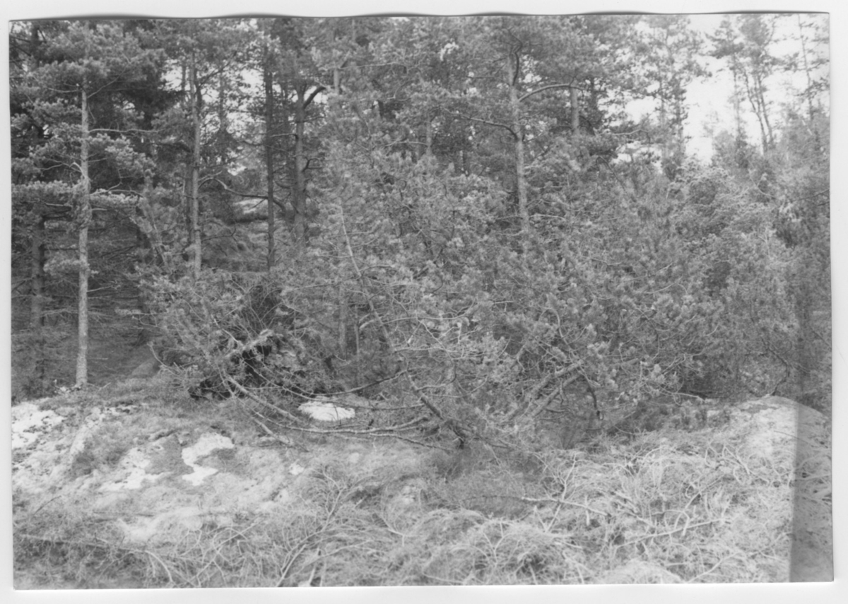 'Bildtext: ''Tallvegetation på berg. Riktning 96.'' :: :: Ingår i serie med fotonr. 6970:1-1125, dokumentation av Hisingens naturgeografi, visande landskapsformerna i stora drag och gjord inför exploateringen av området. Platserna för fotograferingen finns utsatta på karta i skala 1:4000 som finns på Göteborgs Naturhistoriska musem. Fotoriktningen mättes med kompass i gammalgrader.'