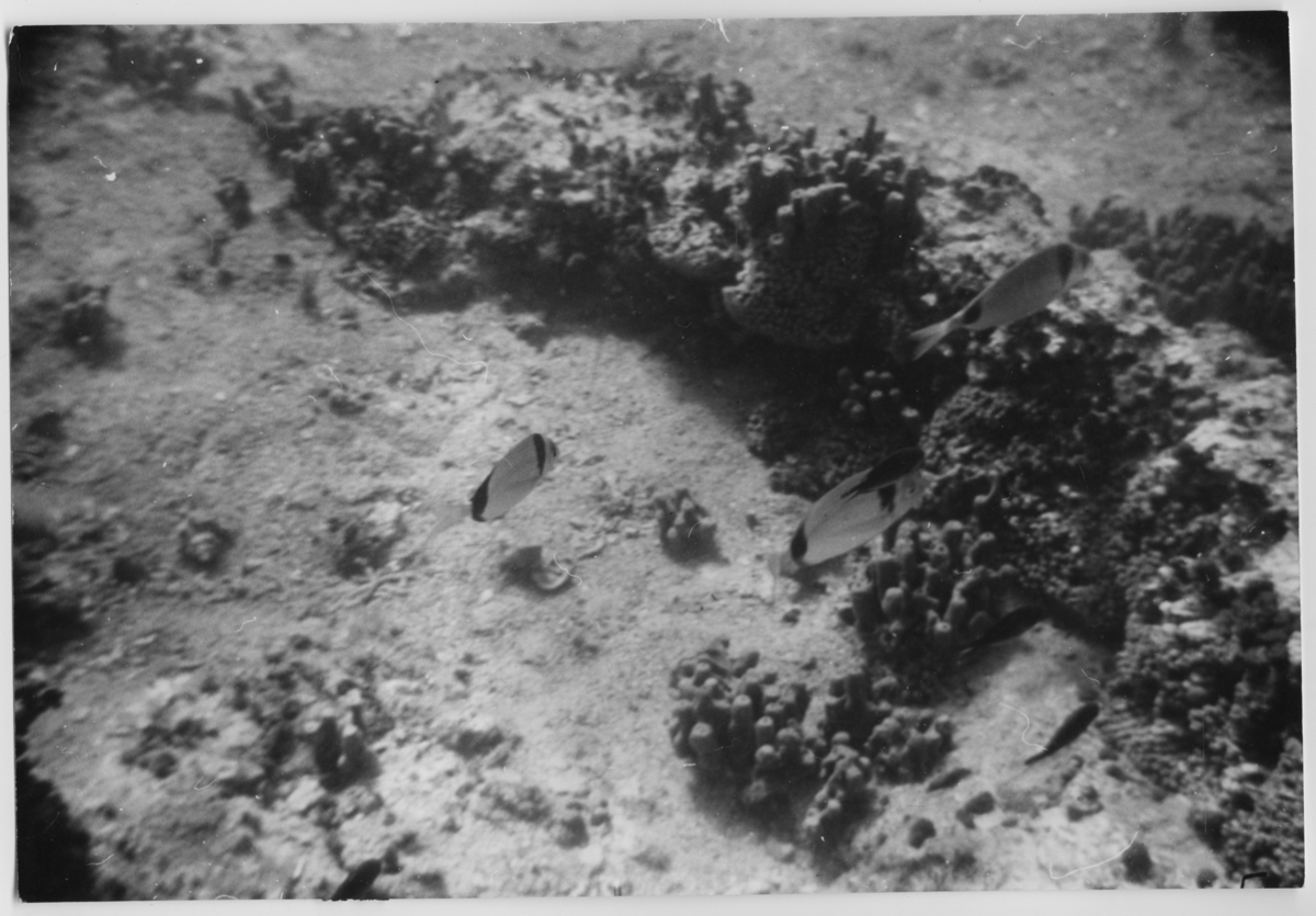 'Text till foto: ''Hur svamparna samlades omkring lämpliga klippryggar. Namnet på fiskarna över klippan? På klippan bak fisken längst till vänster, syns något som bör vara purpursnäcka. Djup ca 5 meter.'' :: :: Ingår i serie med fotonr. 6989:1-9.'