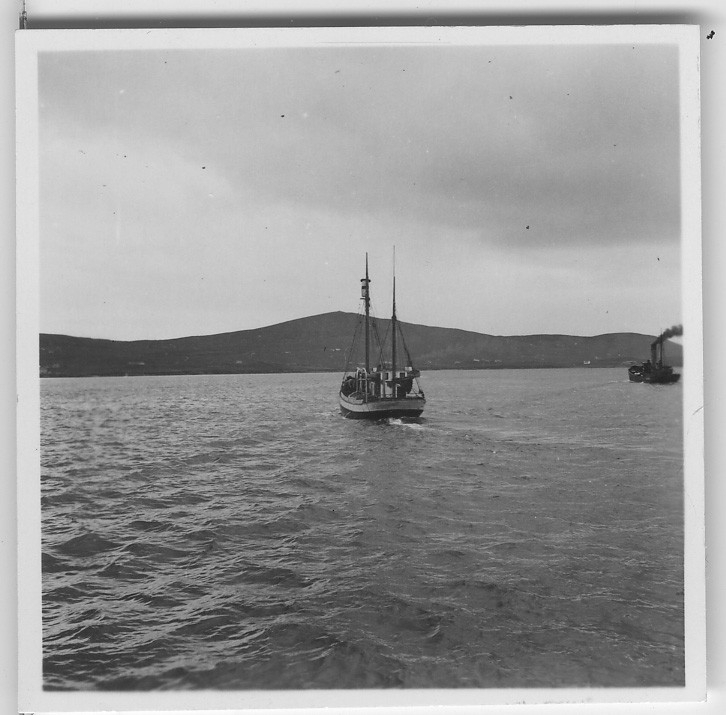 'Från ''Skageraks''-expeditionen till Hebriderna och Shetland: :: :: Valfångare (båt) på utgående från Lerwick(förminskad version av foto nr 4113:23). :: :: Ingår i serie med fotonr. 4113:1-82.'