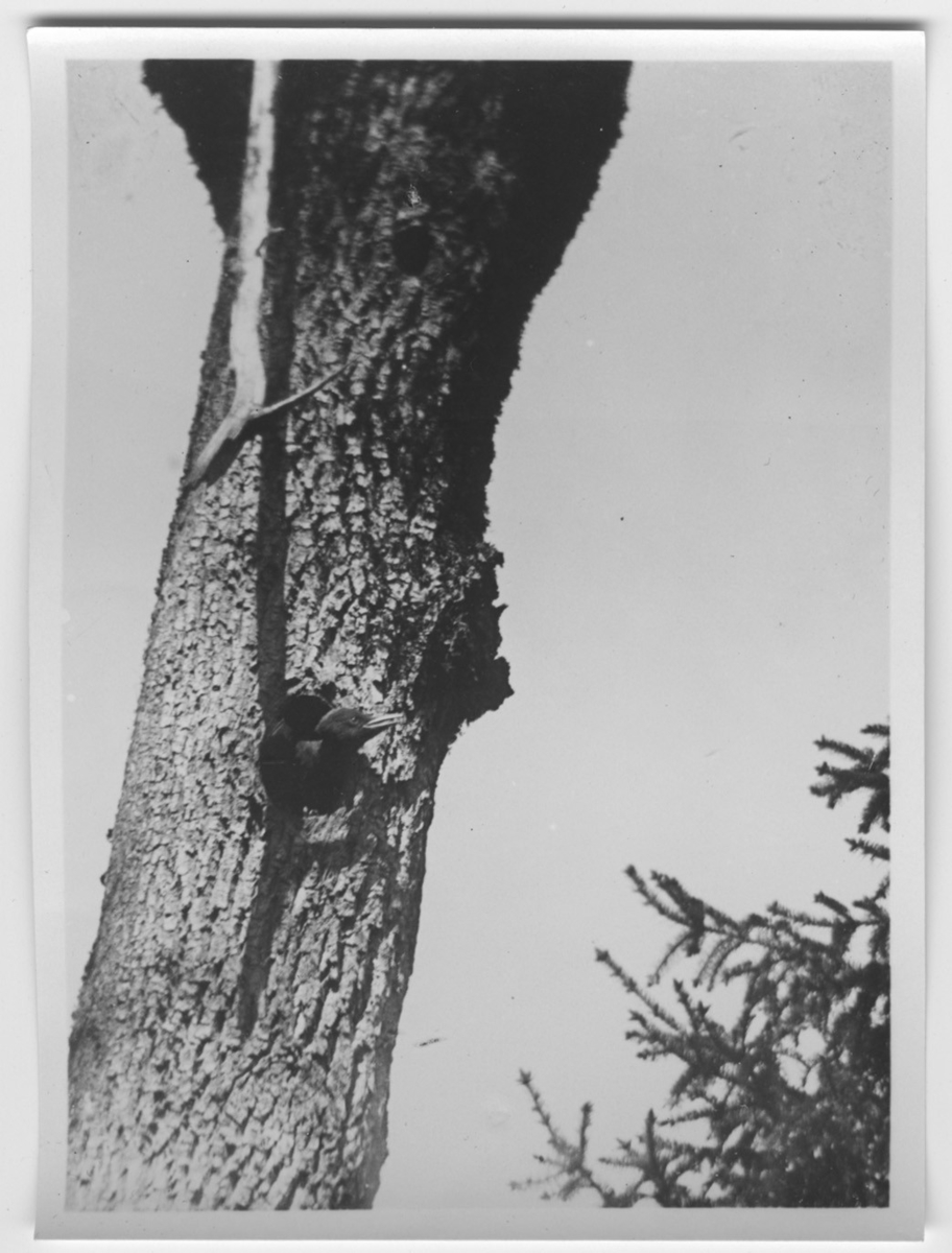 'Spillkråka sticker ut huvudet ur boöppningen, närbild. I bakgrunden grantopp. Se fotonr. 1834, samma motiv. :: :: Ingår i serie med fotonr. 1771-1837. Se även fotonr. 3151-3200.'