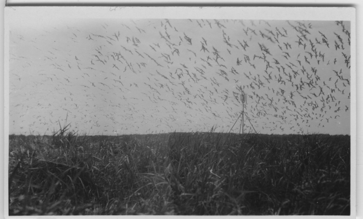 'Göteborgs Biologiska föreningens utfärd till Måkläppen: :: :: Vy med fågelmoln över land. :: :: Se fotonr. 1384-1395, 1618-1639, 1640-1648 samt 3229 från samma utfärd.'