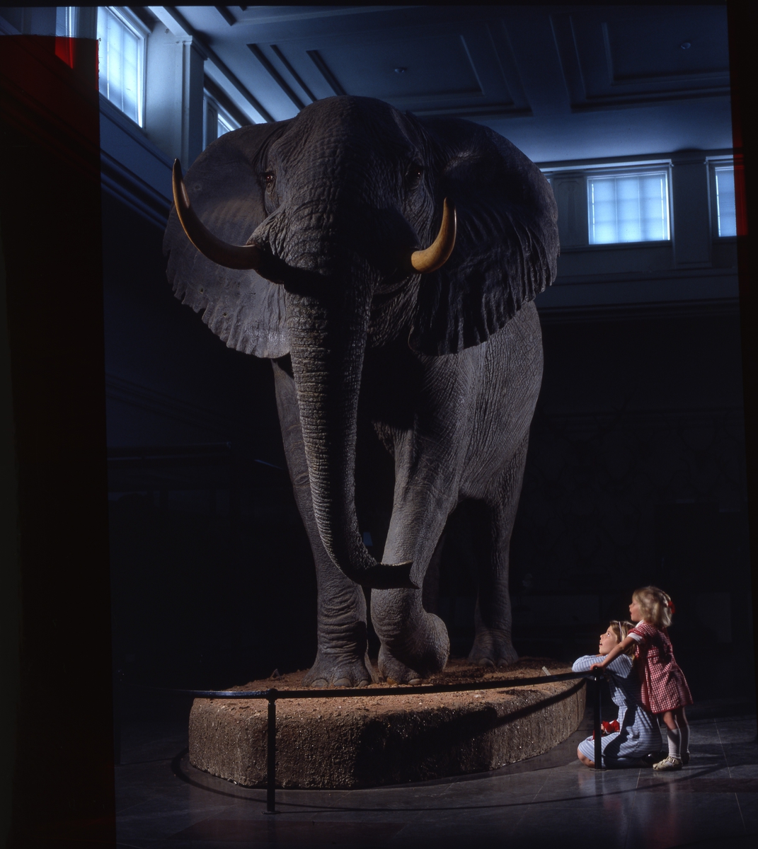 ' :: Afrikansk elefant, monterad av David Sjölander. 2 barn sitter på golvet intill elefantmontaget.'