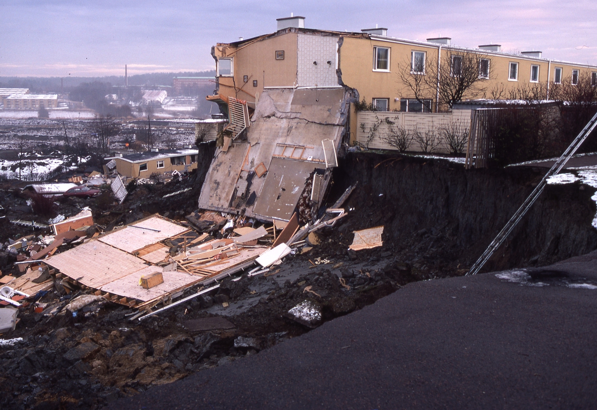 'Lägenhetshus, tvåvåningshus delvis raserat genom skred. cylinderskred, rotationsskred, skålskred :: :: Ingår i serie med fotonr. 7033:1-168 med bilder från Tuveskredet som skedde 30 november 1977''