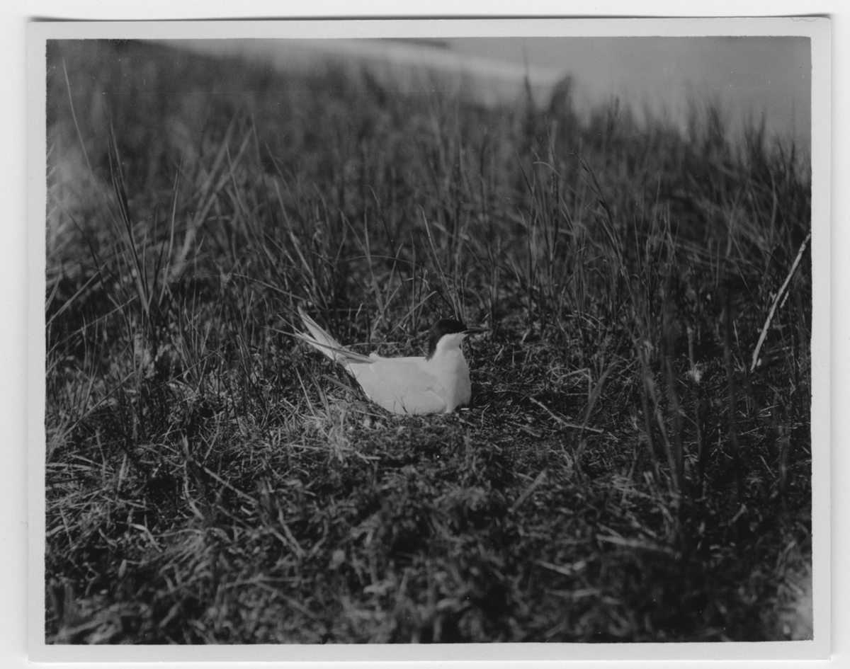 'Silvertärna på boet i gräsvegetation, sedd från sidan. :: :: Ingår i serie med fotonr. 2116- 2160.'