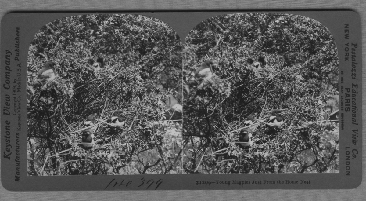 'Minst 5 unga skator i en buske. :: :: ''21206 - Young Magpies just from the home nest.'' :: :: Ingår i serie med fotonr. 315-422.'