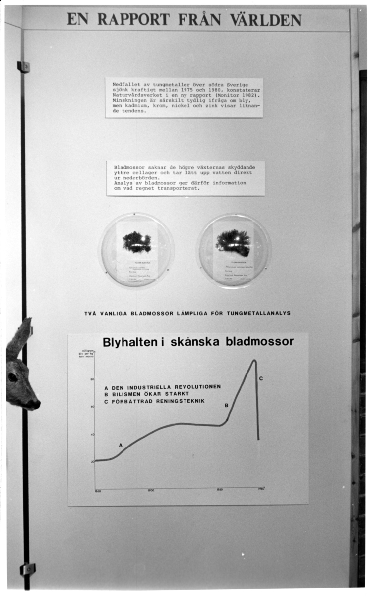 'Foto på Jubileumsutställningen, Göteborgs Naturhistoriska museum 150 år. :: :: Utställningsskärm ''En Rapport från Världen'' angående tungmetallnedfall och blyhalten i skånska bladmossor, med diagram och mossor. Hylocoium splendeus, pleurozium schreberi dessutom del av monterad rådjurshuvud (Gen.kat 71-13.067).'