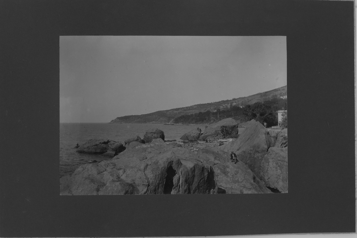 'Vy över havsvik med kala klippor. 1 man sittande på klippa i förgrunden. Bakom syns båtar, ekor och människor samt på avstånd hus. :: :: Se serie med fotonr. 5273:1-17. Serie fotonr 5269-5292, Stuxbergs resa till Kaukasien, 1897.'
