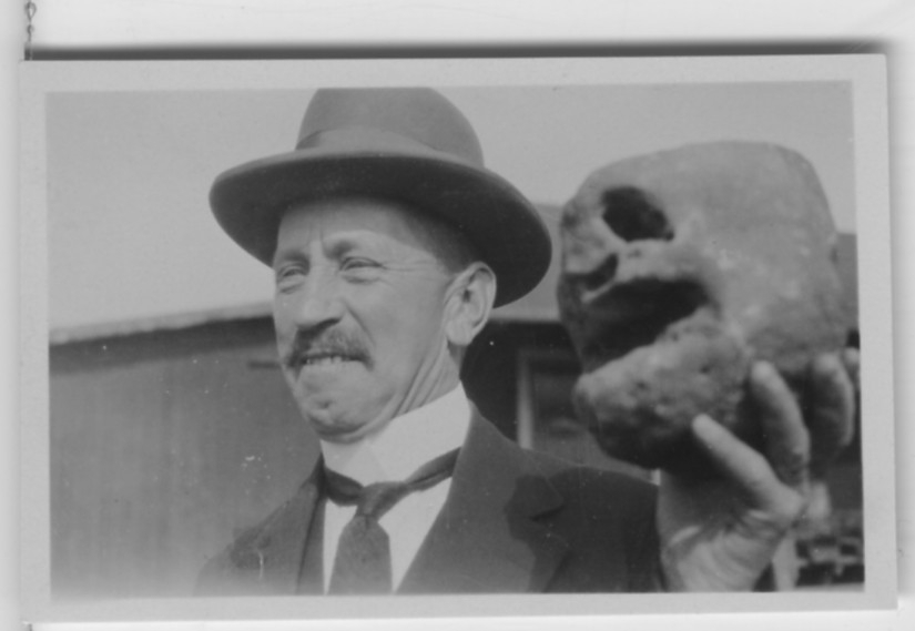 'Biologiska föreningens utfärd till Öland. :: :: Text enligt foto: ''Stinsen på Öland.'' 1 st man i hatt håller upp ett utskuret ''huvud''. :: :: Se även fotonr. 2607-2625, 2583-2606 samt 2883-2911 från samma utfärd.'