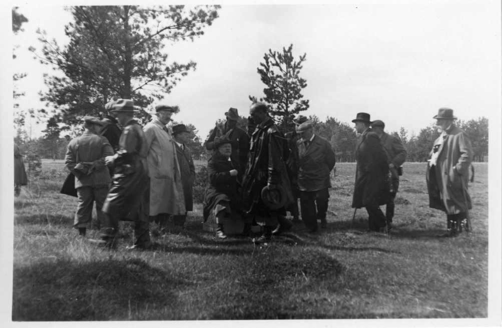 'Biologiska föreningens utfärd till Tåkern, Vadstena m.fl. platser: :: :: Ca 14 män vid Tåkern, på öppet fält med enstaka tallar. :: :: Se fotonr. 3588-3634 samt 3661-3677.'