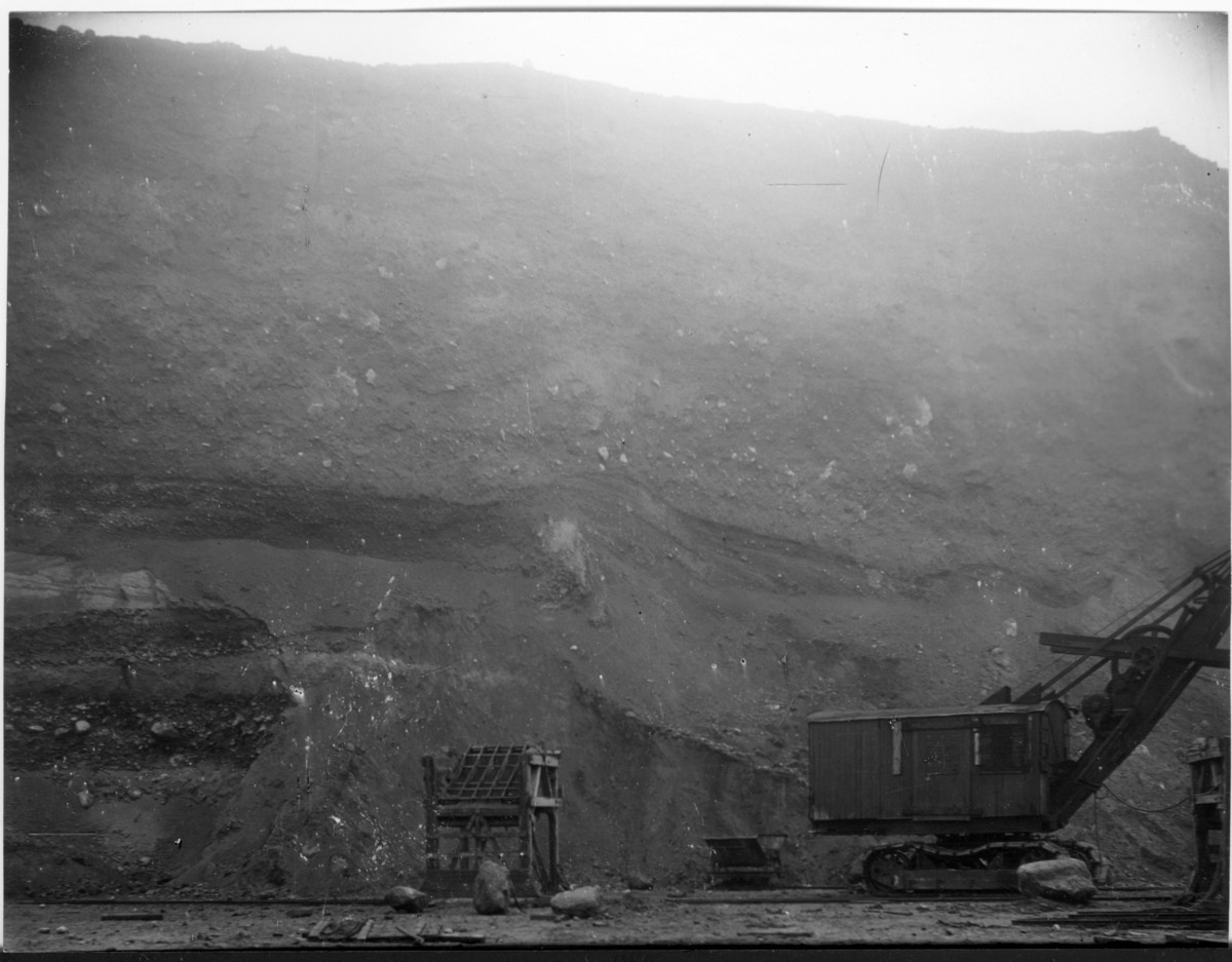 'Vy med vägg i grustaget med maskiner stående framför. Bildtext: ''Fig. 2, mitten. Dösebacka, mittpartiet av västra väggen i södra grustaget, där mammutbeten hittades 1931.'' Grusavlagringens lagerföljder enligt anteckning: Grå moränen, gult grus, gul sand, grovt grus, grå morän och nederst undre morän och ras till vänster i bilden. Grå morän och nederst gula sanden till höger i bilden. :: :: Ingår i serie med fotonr. 7058:1-32.'
