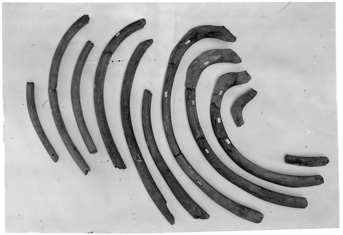 'Höger sidas revben och revbensfragment av swedenborgsvalen. Vångafyndet. (troligen tillhörande Zoologiska Institutionen i Uppsala) :: Bildtext i årstrycket: ''Höger sidan revben och revbensfragment av swedenborgsvalen, Vångafyndet, sedda utifrån.'' :: :: Bilden med i artikel ''Grönlandsvalen från Guldheden och Swedenborgsvalen från Landerigatan'' av Orvar Nybelin i Göteborgs Naturhistoriska Museums Årstryck 1946 s. 108.'