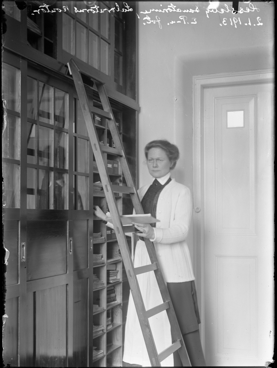 'Bildtext: ''Hessleby sanatorium. Laboratorns kontor.'' 1 kvinna stående vid hylla med fack med böcker, papper och glasdörrar. Intill står en stege. :: :: Ingår i serie med fotonr. 5140:1-39.'