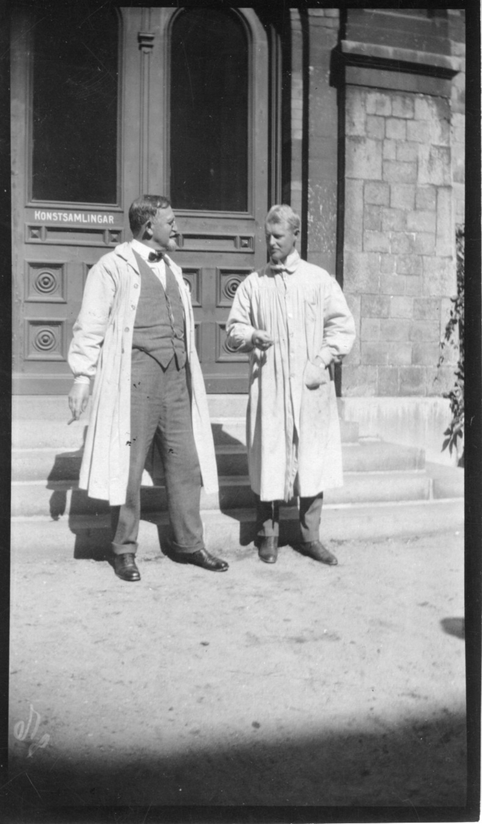 'Från ''Sommarkursen'' på gamla museet, 1916, professor Leonard Axel Jägerskiöld, till vänster, och Dr W.Björk på gården. :: :: Ingår i serie med fotonr. 737-740.'