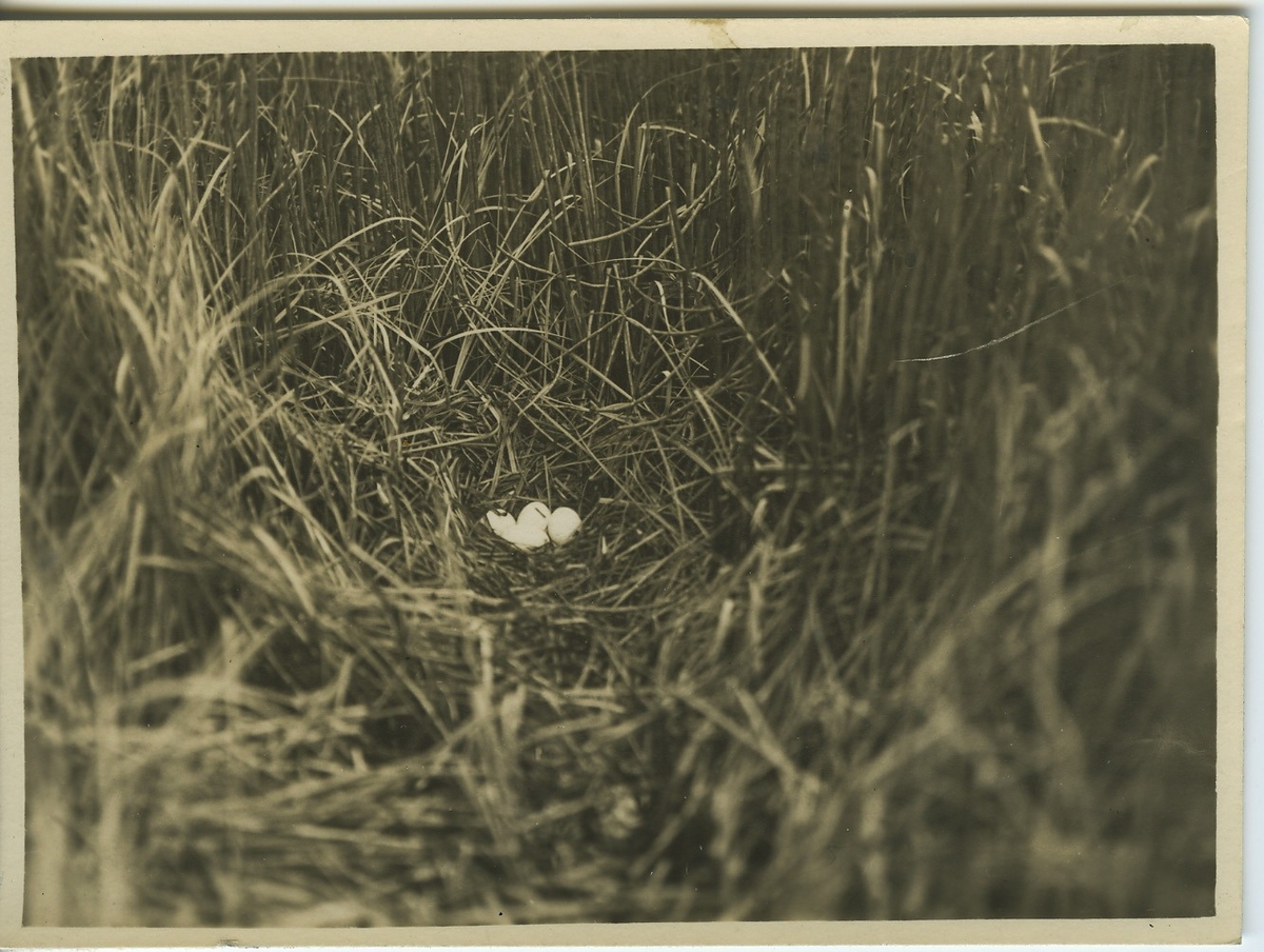 'Skedand bo med minst 4 ägg, i vassvegetation. :: :: Serie fotonr 953-971.'