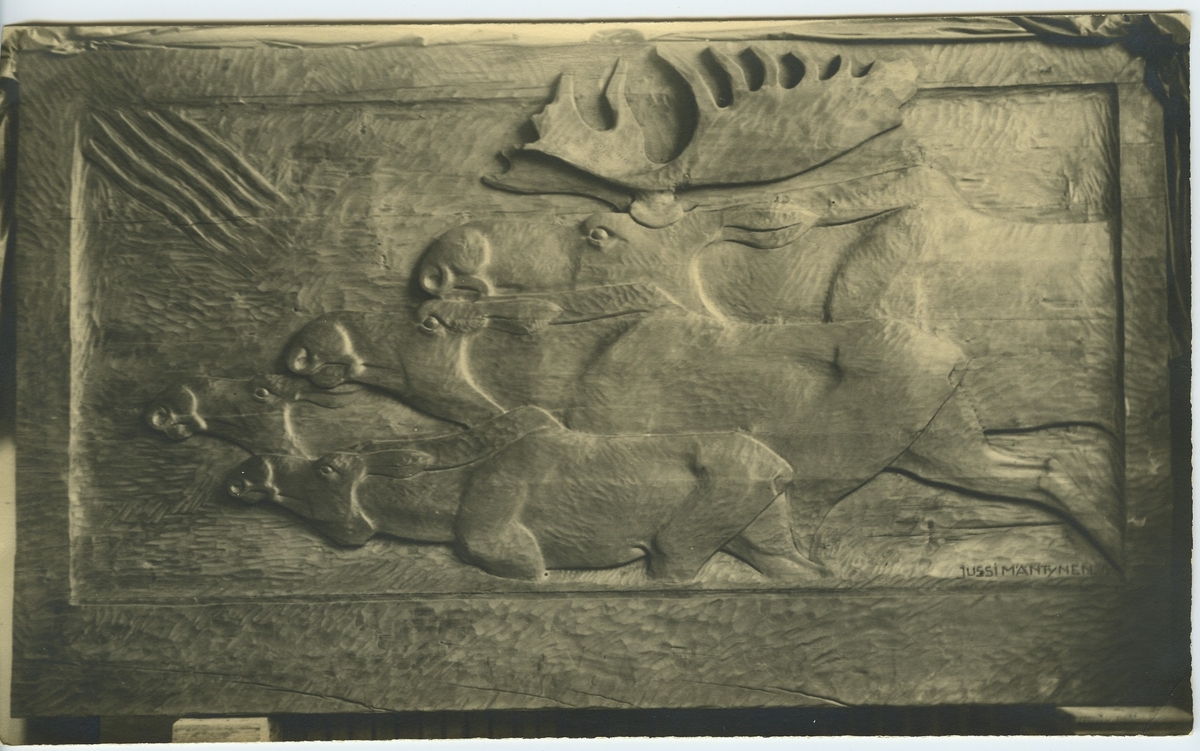 'Älggrupp (relief i fur). Skulptur av Richard Mäntynen. Storlek 286 x 166 cm pris 1700 kr. :: På reliefen står JUSSI MÄNTYNEN som signatur. :: :: Serie fotonr 972-982 av stiliserade djurskulpturer.'