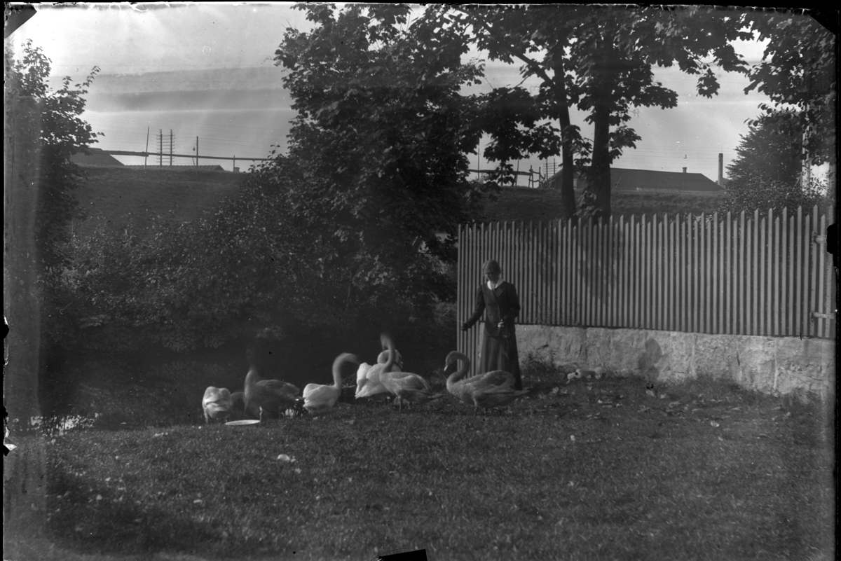 '1 kvinna stående framför trästaket med murad stengrund, matar 5-6 svanar. Se även fotonr. 5140:3, troligen samma plats. Vattenspegel synlig till vänster. I fonden hustak, gatlampa och elledning synlig. Se även fotonr. 5140:3 och 18, troligen samma plats. :: :: Ingår i serie med fotonr. 5140:1-39.'