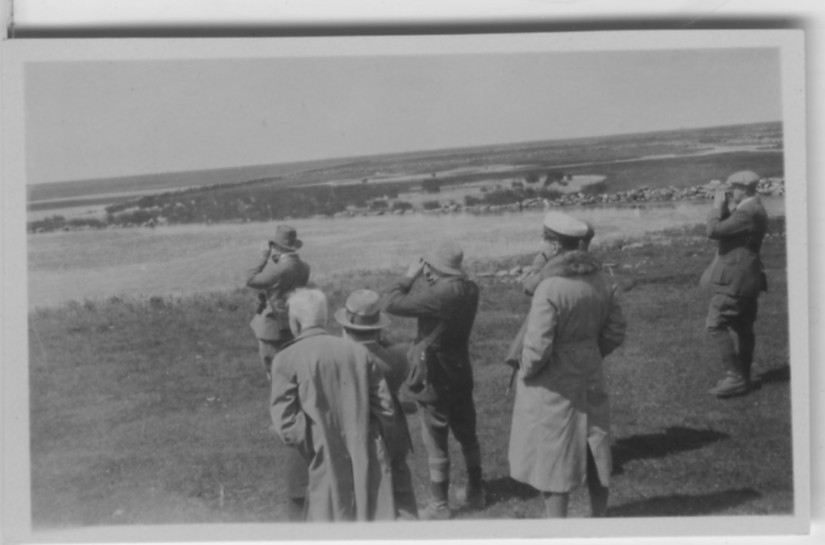 'Biologiska föreningens utfärd till Öland. :: :: Ca 7 st män tittar ut mot havet, flera tittar med kikare, stående på strandängar. :: :: Se även fotonr. 2607-2625, 2583-2606 samt 2883-2911 från samma utfärd.'