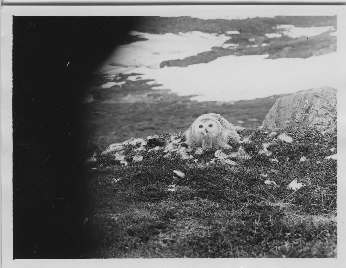 'Fjälluggla ligger på boet intill stenblock. I fonden delvis snötäckt mark. :: :: Ingår i serie med fotonr. 4169:1-13. :: :: Ingår i seie med fotonr. 4167-4175.'