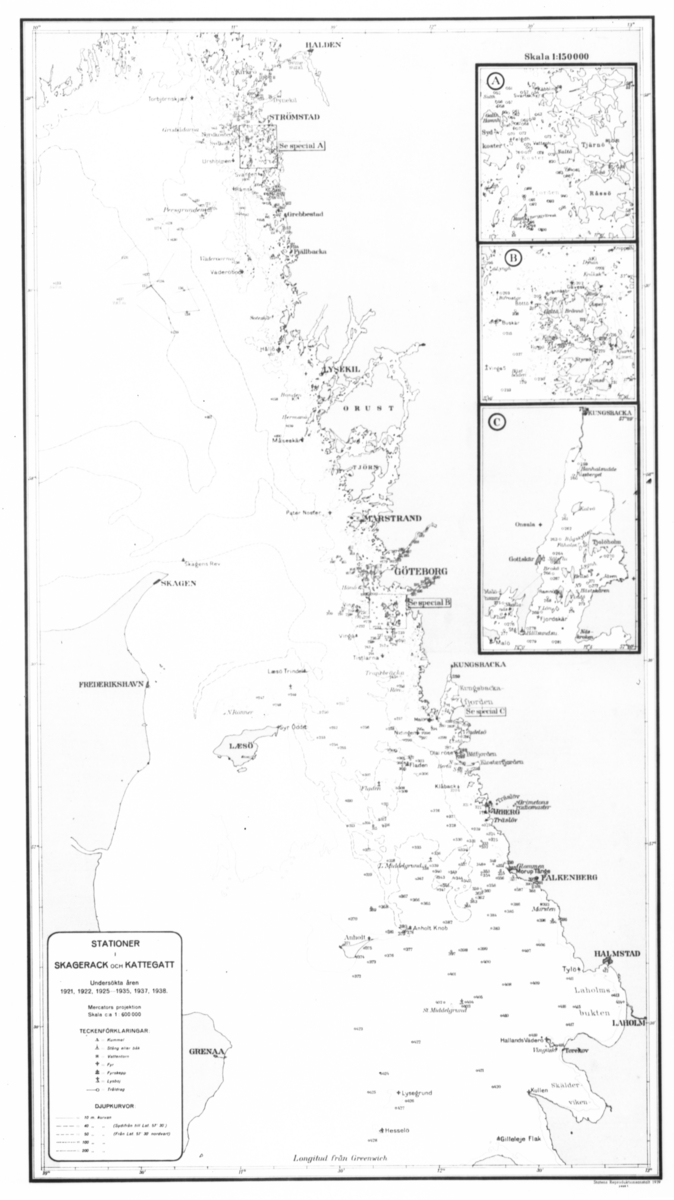 Karta. Stationer (Leonrad Axel Jägerskiölds, Wahrberg-Eliason, Wahrberg-Oldevig.) i Skagerack och Kattegatt undersökta åren 1921, 1922, 1925-1935, 1937 och 1938. Skala 1:600 000.