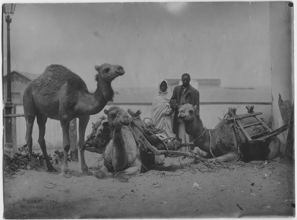 3 dromedarer, 1 stående samt 2 liggande med packning. Invid djuren står 1 kvinna och 1 man framför mur. Lyktstolpe och hus.