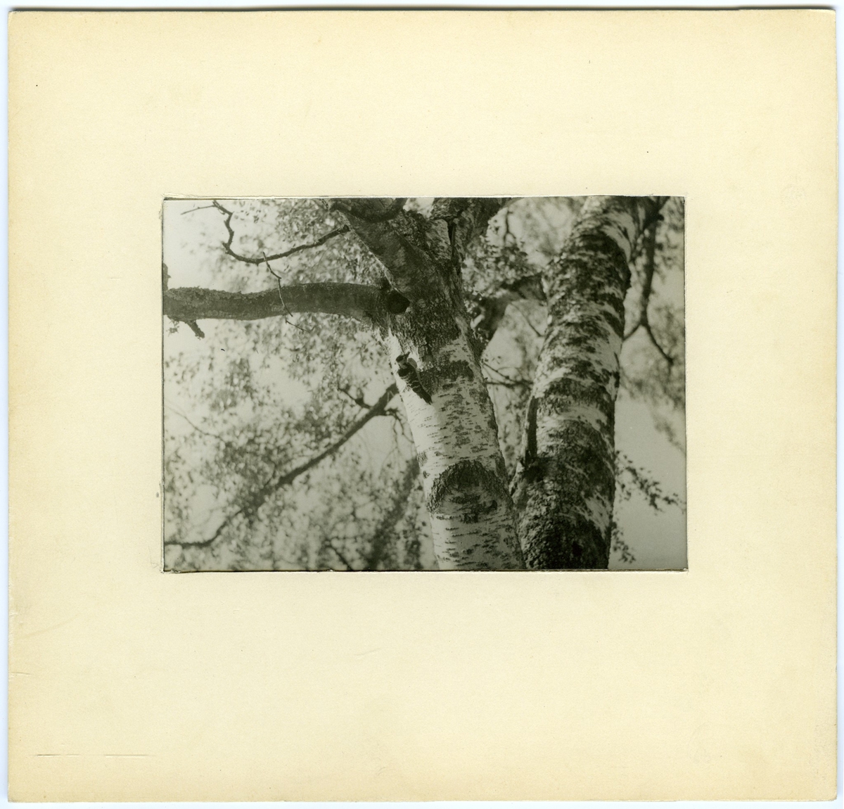'Bildtext: ''Mindre hackspett i boöppningen med mat åt ungarna.'' :: Närbild på mindre hackspett sittande på björkstam nedanför boet. :: :: Ingår i serie med fotonr. 7083:1-55.'