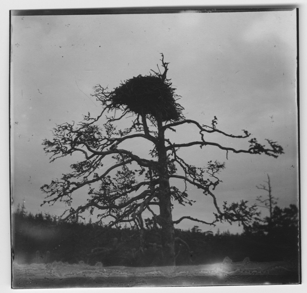 'Havsörn, bo i trädtopp (ev. tall). Vy. :: :: Ingår i serie med fotonr. 817-841.'