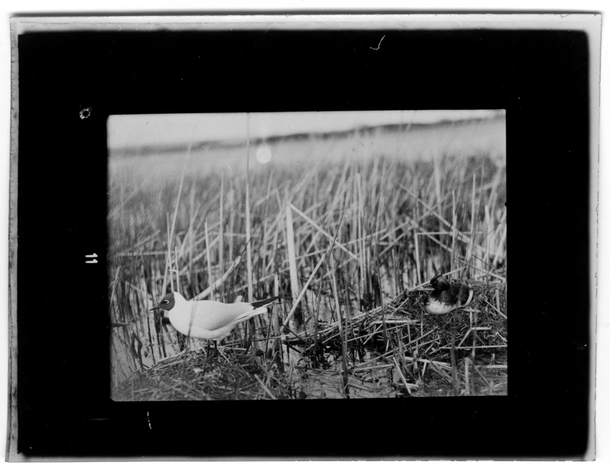 '1 fiskmås och en svarthalsad dopping. ''Låter sig ej störas av skrattmåsens besök på det gamla doppingboet brevid''. :: :: Ingår i serie med fotonr. 1661-1689.'