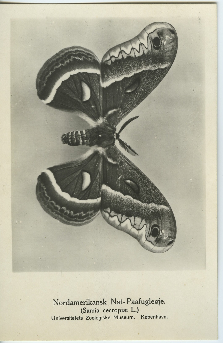 'Sydamerikanskt nattpåfågelöga. :: Oskrivet vykort från Universit. Zoolog. Museum, Köpenhamn, 1925. :: :: Ingår i serie med fotonr. 1003-1014.'