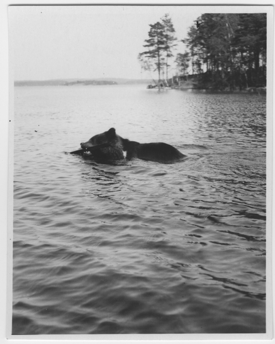 'Björn som simmar med en pinne i munnen. Vy med en del av land med tallträd på berghäll. :: :: :: Ingår i serie med fotonr. 1751-1759.'