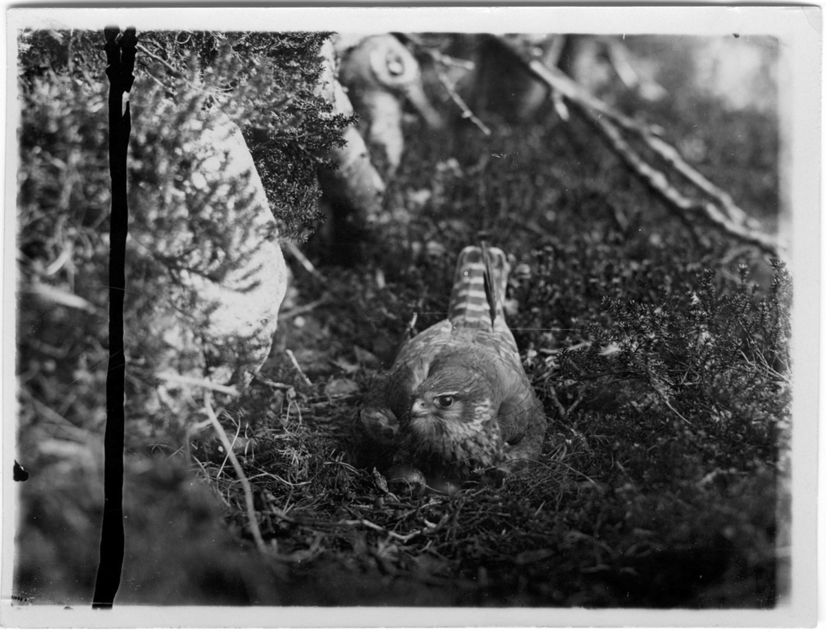 'Dvärgfalk ruvande på boet. Närbild. Ägg synliga. :: :: Ingår i serie med fotonr. 1690-1708.'