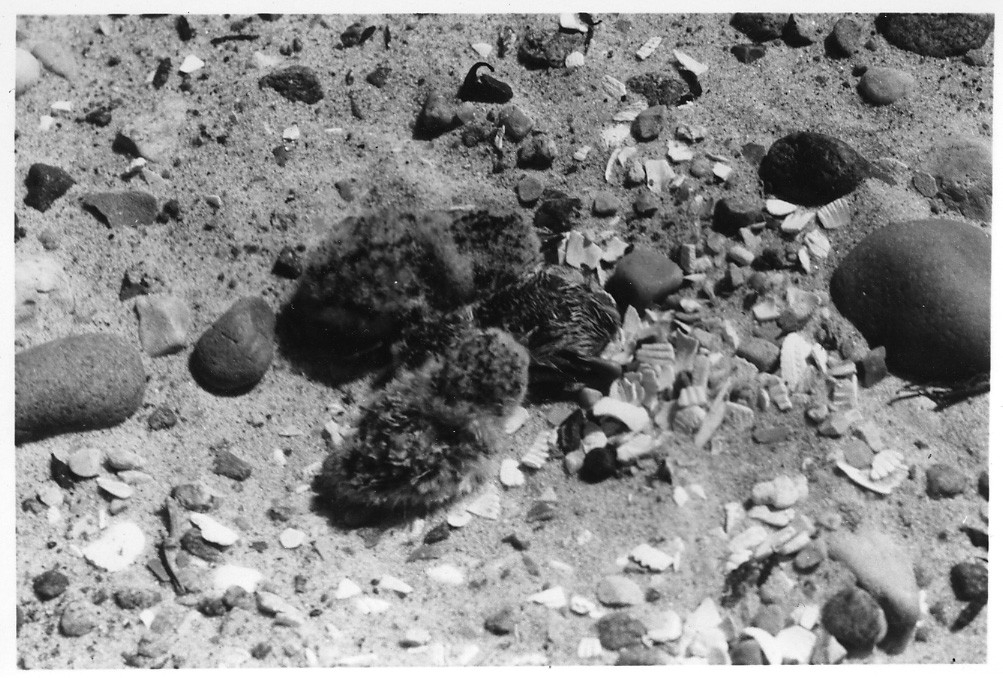 'Kattegattexpeditionen 1933: :: :: ca 3 st fågelungar i närbild, bland snäckskalsbitar och musselskalsbitar i sanden. :: :: Ingår i serie med fotonr. 2804-2826.'