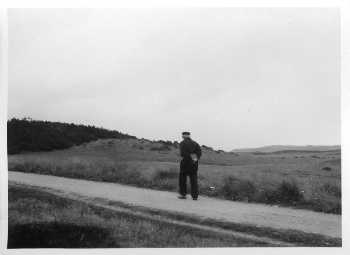 'Akka-expeditionen sommaren 1930: :: :: Vägen från hamnen till byn. 1 man går på väggen, ryggen mot kameran. Vy med öppen gräsmark. :: :: Ingår i serie med fotonr. 2033-2087.'