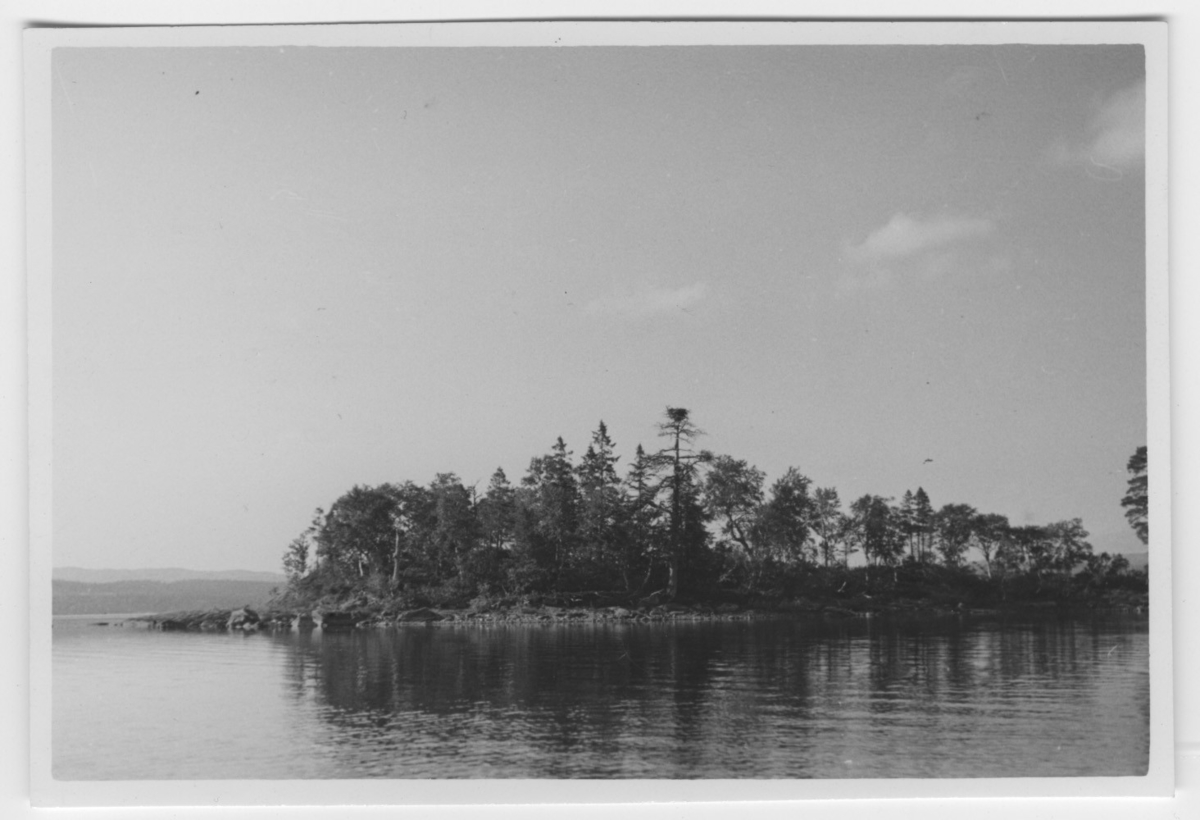 Bo av fiskgjuse i talltopp. Vy över holme med tallar.