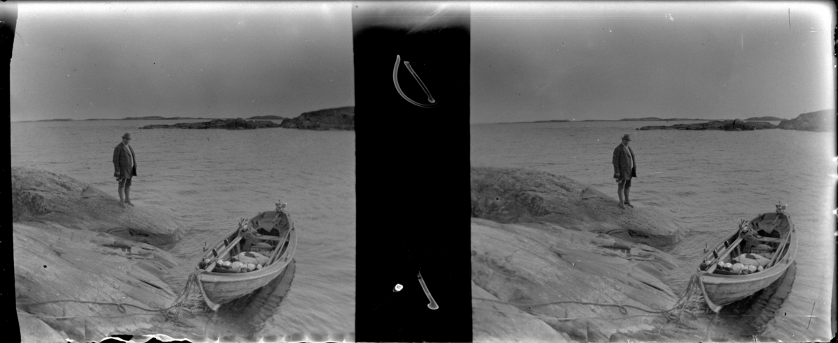 'Bildtext: ''J.E.F., tordmulejakt vid Tärnskär.'' :: 1 man stående på berhäll ner mot vattnet där en eka, roddbåt ligger lastad med bl.a. skjutna tordmular. Åra. Motor. :: :: Ingår i serie med fotonr. 5255:1-18, se även hela serien med fotonr. 5237-5267.'
