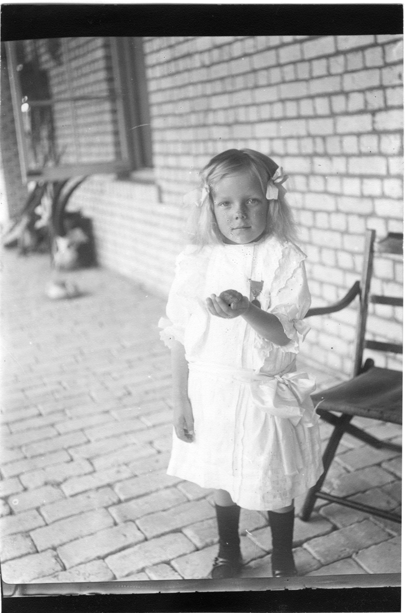 'Diverse fotografier från bl.a. dåvarande Nordrhodesia, nu Zambia, tagna av Konsul Magnus Leijer. :: :: En flicka stående på en stenveranda, vänd mot kameran håller hon upp handen och visar något hon har i den. Bakom henne är en stol och ett fönster synligt.'