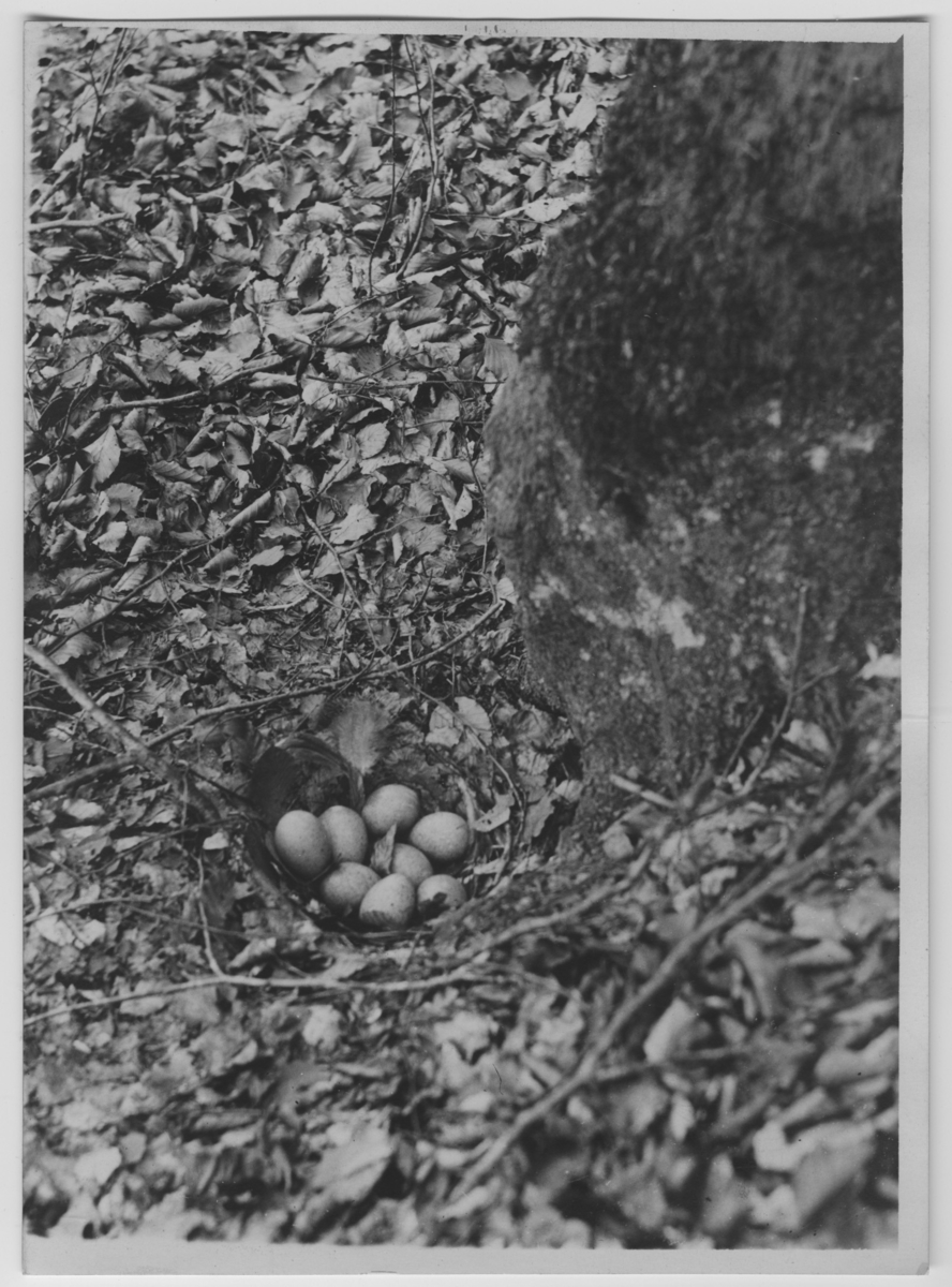 'Tjäderbo med 8 ägg nedanför trädstam på boklövsklädd mark. :: :: Se även fotonr. 3069.'