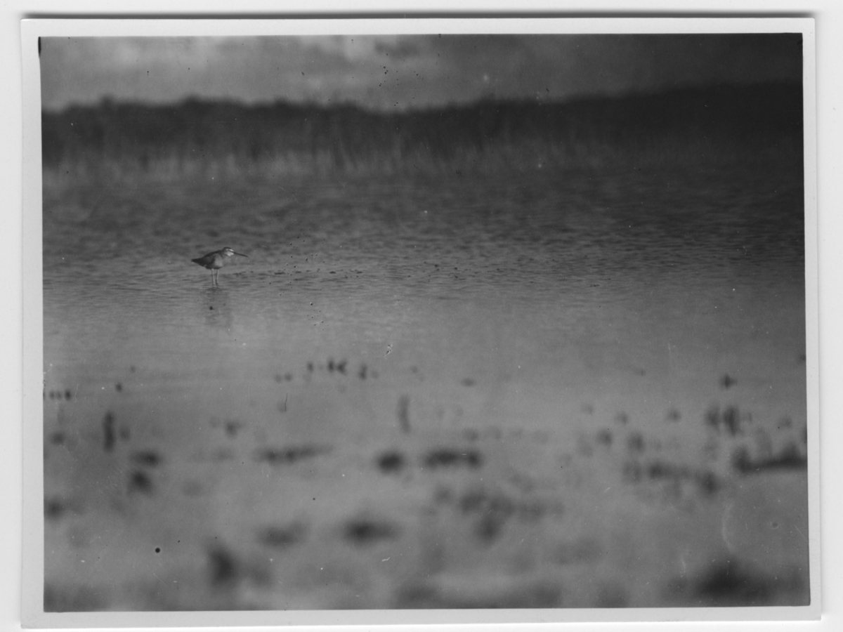 'Svartsnäppa, juvenil. Vadande i sjön, på avstånd. :: :: Ingår i serie med fotonr. 3290-3307.'