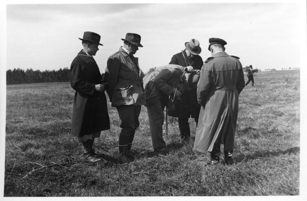 'Biologiska föreningens utfärd till Tåkern, Vadstena m.fl. platser: :: :: 5 män på öppet fält. Enligt fototext: Melander fotograferar storspovbo. Vy med skog på avstånd. :: :: Se fotonr. 3588-3634 samt 3661-3677.'