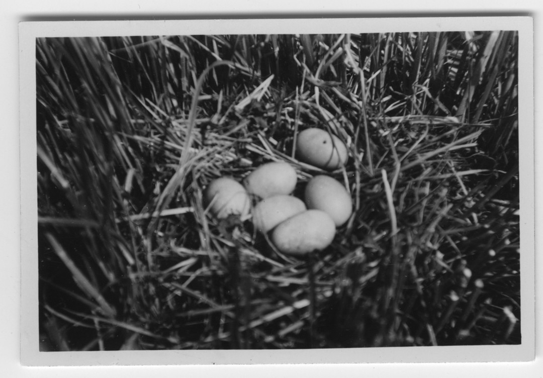 'Bo med 6 st ägg av vigg, närbild. :: :: Text på baksidan av fotot: ''Bo med 6 st nyvärpta ägg av viggen i starrgräs ungefär 10 meter från stranden. Reden bestod av färskt gräs. Ungefär 25 meter från detta bo fanns ett annat av viggen med 4 st ägg. Fotot taget på 1 meters avstånd.'' :: :: Ingår i serie med fotonr. 4500:1-172.'